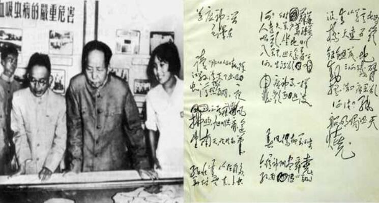左图为毛泽东同志参观血防展;右图为毛泽东同志《七律二首·送瘟神》手稿。
