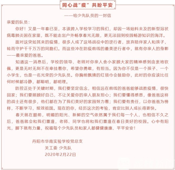 丹阳市华南实验学校党总支、关工委、少先队给学校全体少先队员们写了一封信,鼓励队员们同心战“疫”,共盼平安。