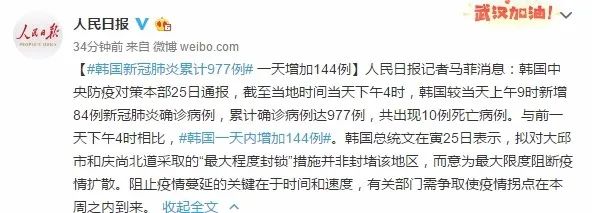 韩国中央防疫对策本部25日通报,截至当地时间当天下午4时,韩国较当天上午9时新增84例新冠肺炎确诊病例,累计确诊病例达977例,共出现10例死亡病例。与前一天下午4时相比,一天内增加病例144例。