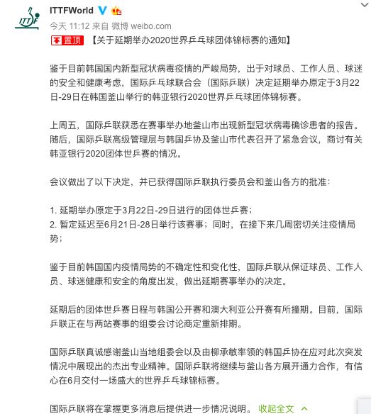 鉴于目前韩国国内新型冠状病毒疫情的严峻局势,国际乒联发布通知称,决定延期举办原定于3月22日-29日进行的团体世乒赛。
