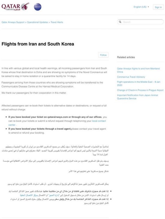 此外卡塔尔航空还要求来自韩国和伊朗的,目的地为多哈的旅客在抵达卡塔尔后,在没有任何新冠病毒感染症状的情况下,应当在家中或相关检疫场所隔离14天,如果出现疑似症状,则将被送往哈马德医疗集团下属的传染病医院进行隔离治疗。