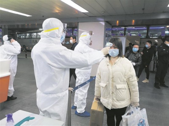 工作人员在出站口给到达旅客测温。