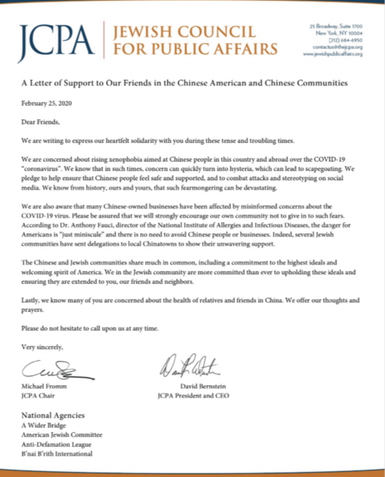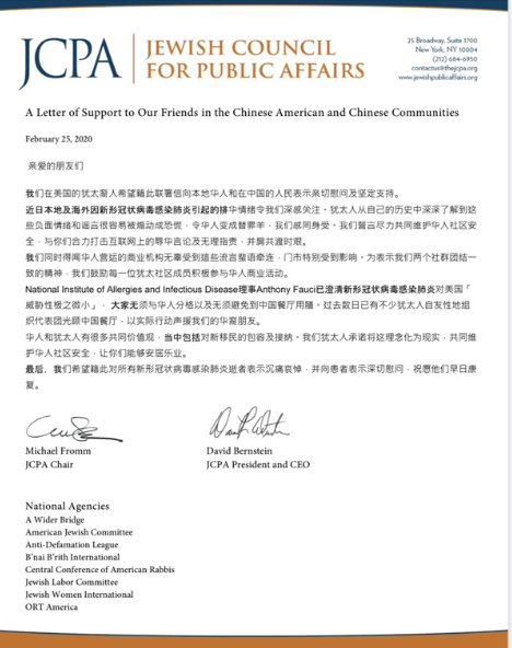 据美国犹太人公共事务委员会(JCPA)官网25日消息,70余个美国犹太人组织于21日发表联名信,对新冠肺炎疫情下的排华情绪表示反对,并向在美华人和中国人民表示亲切慰问和坚定支持。