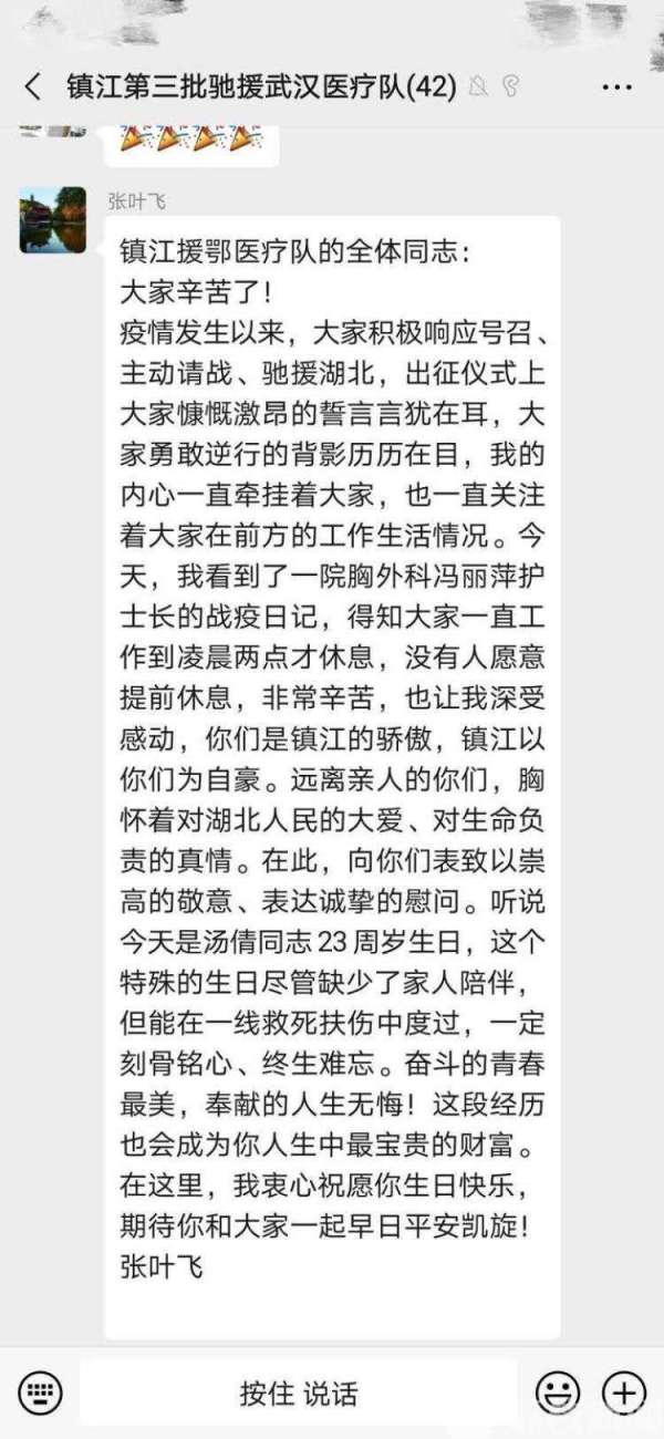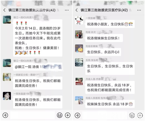 (江苏医疗队员们以及镇江市长张叶飞在微信群中为汤倩隔空送上祝福)