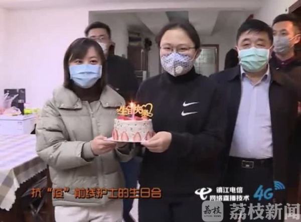 (家人和同事通过视频连线为汤倩庆生。 图片/镇江民生频道)