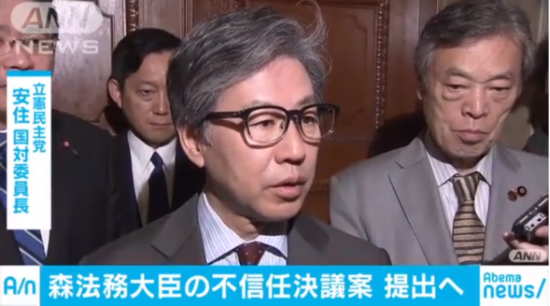 在野党方面因此表示,将向森雅子提出不信任决议案。立宪民主党国会对策委员长安住淳说:“本来,最应该守法的法务大臣擅自变更(司法)解释,做了脱离法律的举措。我不得不认为她没有履行好法务大臣该有的责任。”
