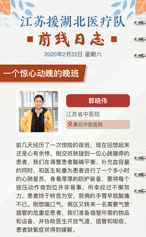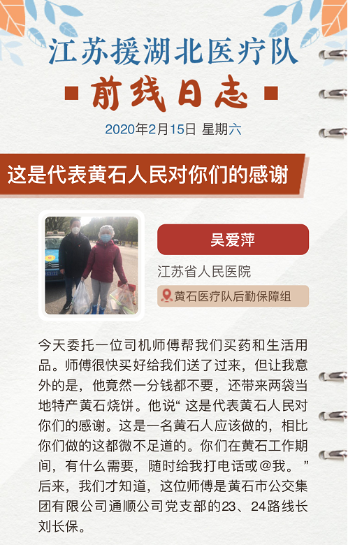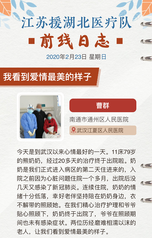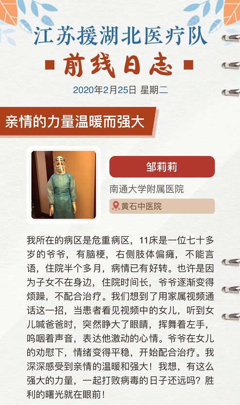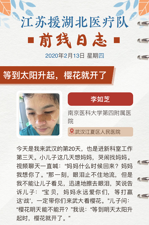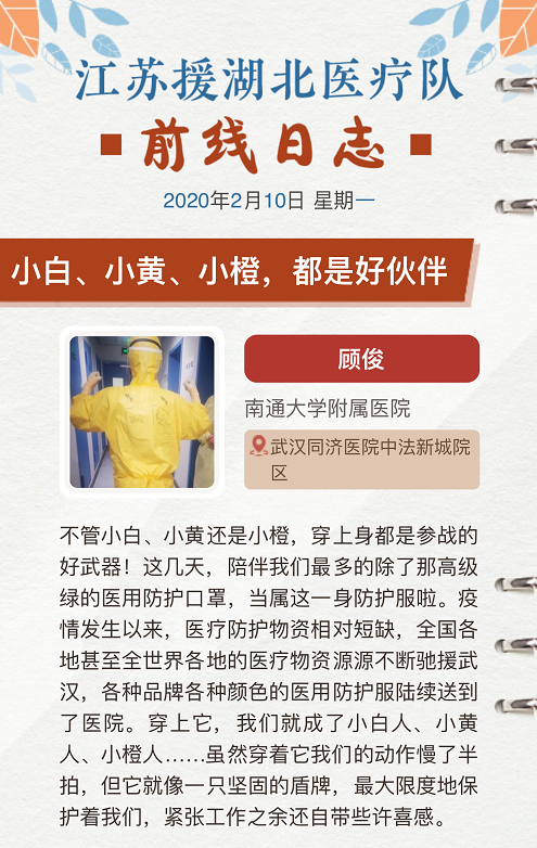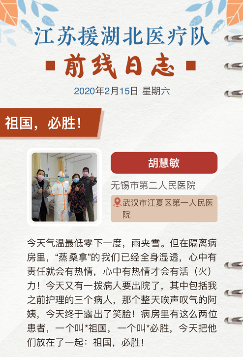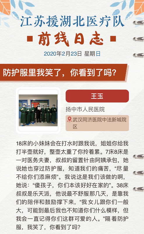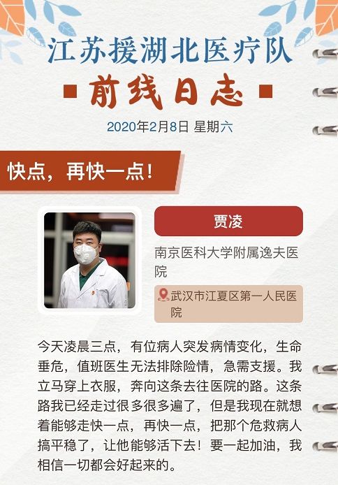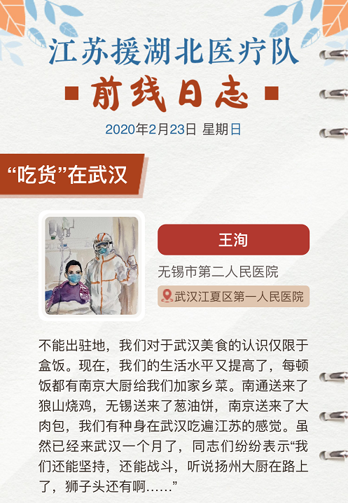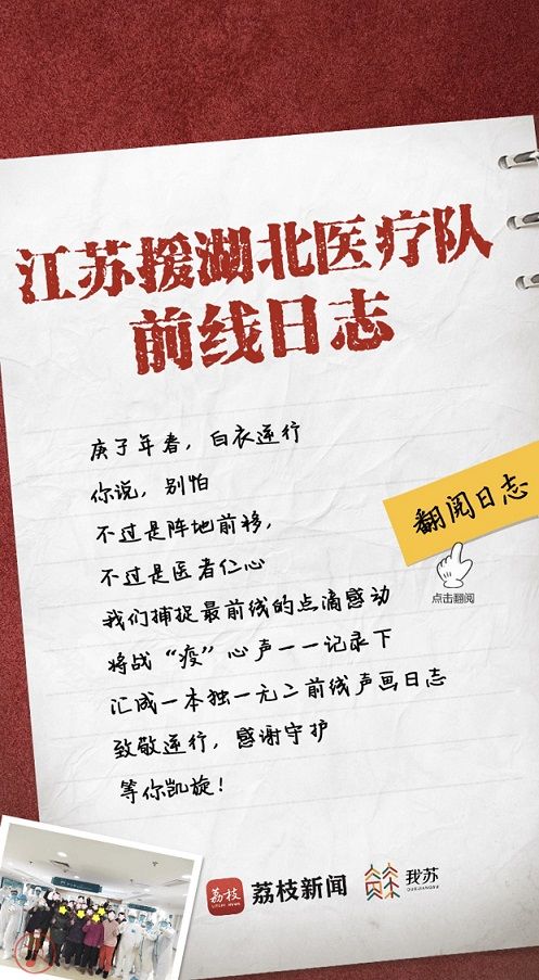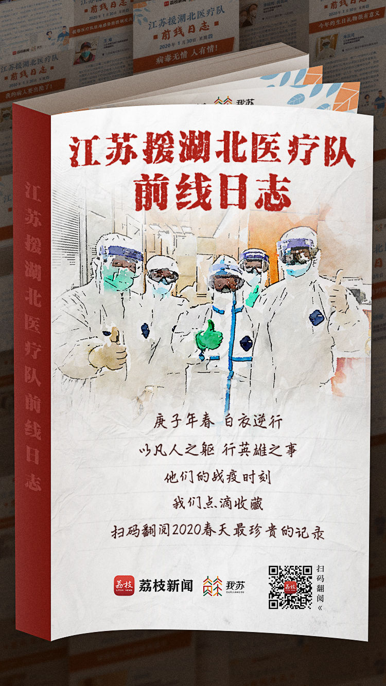1月26日起,荔枝新闻&我苏网每晚推出《江苏援湖北医疗队前线日志》,将这群“白衣战士”的战“疫”心声一一记录下,与网友一起见证每一份执着的信念与希望,温暖与感动。戳看“江苏援湖北医疗队前线日志”专题>>