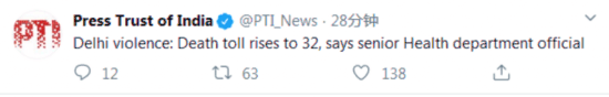印度报业托拉斯(PTI)刚刚消息,印度卫生部一名高级官员透露,德里地区自24日开始暴发的骚乱冲突事件已致32人死亡。