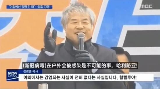 首尔市政府21日下令禁止市区内各场所举行集会活动,以防止疫情扩散。但韩国基督教协会会长、民粹主义牧师全光勋22日和23日接连公然违反禁令,组织领导“要求文在寅下台泛国民斗争本部”在光化门广场组织大规模示威集会。他还在集会上公然宣称,“在户外不会被感染”,”如果感染病毒,上帝会治愈你们“,“即使不被治愈也没关系,我们的目的就是死亡”。这样的鼓吹已完全无视防疫的科学规律,妖言惑众的程度堪比邪教。
