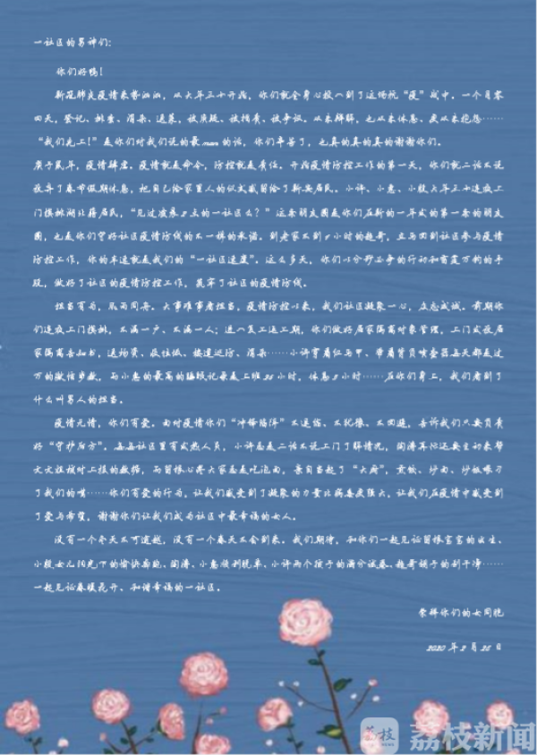 新安街道新安花苑第一社区女同志们笑着说:“在防疫期间他们所做的确实让我们感动,我们都没给自己丈夫写过信,却把第一次写的信给了我们社区男同胞们。”