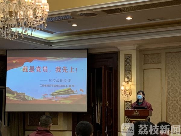 党课开始前,由江苏援黄石医疗支援队医疗救治及专家组组长、东南大学附属医院副院长黄英姿教授发言。作为一名党员,她曾多次主动申请上前线。黄教授希望在这次战斗中,来自江苏各地医院的党员同志们,凝聚成一支军队,发扬“我是党员我先上,我是组长我先上”的精神,充分发挥先锋模范带头作用。