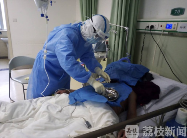 今天一早,我们一行7人提前10分钟来到了感染23病区。我今天负责整个病区的所有医嘱处理。病区共有3个病危患者,70床是其中之一。该患者目前心电监护、持续无创呼吸机辅助通气并且静脉营养中。今天负责护理这位患者的是鼓楼医院江北院区胸外科护士吕晓霞。针对这位患者,护士们来到床边,进行了15分钟的交接班。当时患者生命体征平稳,正安静休息。
