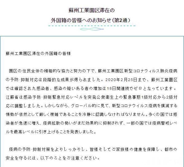 为了严防境外输入,苏州市级及多个板块区域都对外发布了多语言版本的致外籍人士的公开信,信中明确了涉外发热门诊医院,设立24小时热线电话,并提醒近期从日本、韩国等国来苏人员,第一时间向所在社区报到,配合社区做好居家隔离医学观察14天。