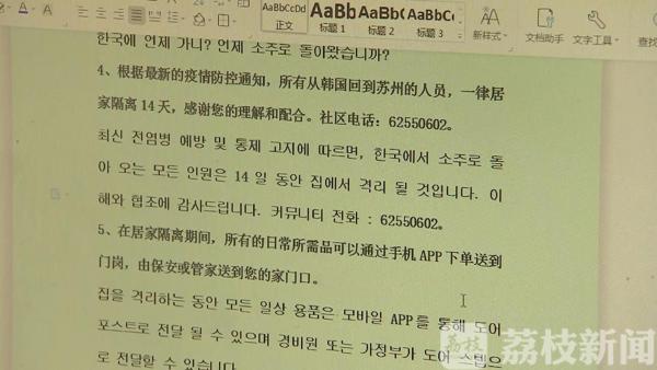 玲珑湾社区居住着1300多名日韩籍居民和数百名东南亚、欧美籍居民。随着苏州工业园区内外资企业陆续复工,也迎来了外籍人士返苏小高潮,这几天仅打算从韩国回来的外籍人士就有100多位。从外籍人士准备返苏到入户安顿,社区党委联合小区物业,全程陪同引导,发放英日韩三种语言版本的《温馨提示》,告知他们居家隔离的必要性和注意事项。当外籍人士在沟通、生活上遇到困难时,社区工作人员和物业管家出面协调,保障他们的日常生活。