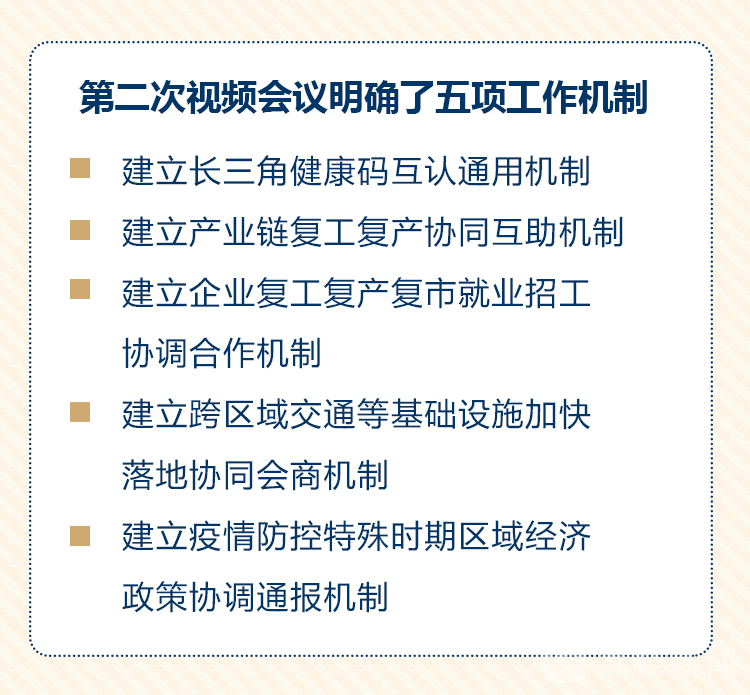 当前,统筹抓好疫情防控和经济社会发展工作,需要长三角三省一市进一步协同发力、深化合作,在继续严格落实疫情防控措施前提下,更好推进复工复产复市。三省一市第二次视频会议明确了五项工作机制。一是建立长三角健康码互认通用机制,按照“有码认码、无码认单”的原则,为三省一市复工复产和群众正常生活提供便利。二是建立产业链复工复产协同互助机制,全面梳理形成打通跨区域产业链的企业清单,强化供需匹配和原材料、零部件生产供应,落实通关、物流一体化等协同举措保障物资运输畅通。三是建立企业复工复产复市就业招工协调合作机制,联合搭建企业用工对接服务平台,组织开展各类线上对接活动和招聘会,精准匹配缺工企业和就业重点群体供需,共同开辟员工返岗绿色通道。四是建立跨区域交通等基础设施加快落地协同会商机制,对已开工建设的项目,加强用工、物资运输等合作,抢抓项目建设进度;对处在前期工作阶段的项目,协同做好规划落地、方案稳定、项目报批、要素保障等相关工作,力争尽早开工建设;对纳入长三角一体化发展国家规划纲要、三年行动计划的项目,抓紧规划研究和项目储备。五是建立疫情防控特殊时期区域经济政策协调通报机制,加强政策协同,扎实做好“六稳”工作,在支持复工复产复市、扶实体稳产业保就业等方面加强沟通衔接。