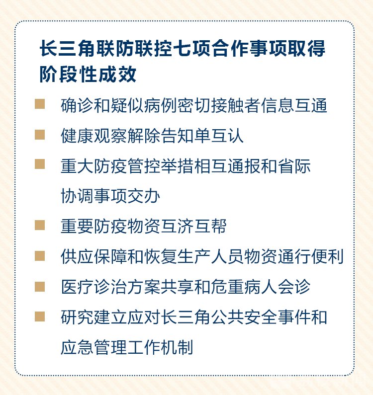 按照第一次视频会议部署要求,在三省一市共同努力下,长三角联防联控七项合作事项落实具体举措、推进重要合作,在疫情防控中发挥了重要作用,取得阶段性成效。在确诊和疑似病例密切接触者信息互通方面,有条不紊开展信息推送、交换、比对和通报工作。在健康观察解除告知单互认方面,实行统一样式告知单,并探索使用健康码。在重大防疫管控举措相互通报和省际协调事项交办方面,成功协调多个跨省事项。在重要防疫物资互济互帮方面,形成紧密工作网络,一批重要物资实现相互调配。在供应保障和恢复生产人员物资通行便利方面,免除持证车辆重复查验人员重复隔离,有效保障重要物资运输畅通。在医疗诊治方案共享和危重病人会诊方面,为各地救治提供有力技术支撑。在研究建立应对长三角公共安全事件和应急管理工作机制方面,已经形成一批具体工作安排。