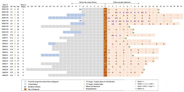 24位无症状感染者的基本信息,蓝色框为在湖北的时间,实心棕色三角代表核酸检测阳性,空心棕色三角表示核酸检测阴性