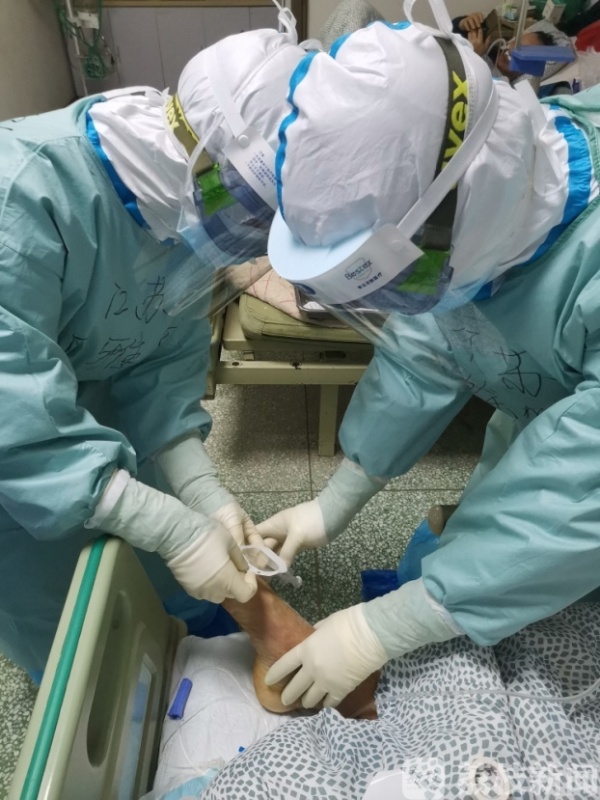 “有个爷爷总是不太配合治疗,在我们不注意的时候会偷偷把针拔掉,之前已经拔掉过三次了。”有天刚接完班不久,徐胜宏就听说老爷子又把针拔了,于是他就跟居雅蓓一起再次端起了治疗盘,他们评估完老人的血管后,觉得还是有几处可以穿刺的地方,为了防止老人再次拔针,他们特地选择在脚部穿刺,一针见血!固定,挂水一气呵成!“后面的穿刺也十分顺利,黄石的老师们都说,以后我们组的穿刺可以由我们包了。”