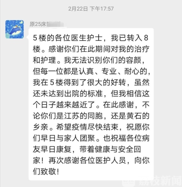 这份细致和耐心,同病房的病友还有黄石的同行都看在眼里,大家说他们耐心特别好。是不是因为来自儿童医院的缘故?“也许是吧,本以为我们长期从事儿科护理工作,来到成人医院会不太适应,会给大家拖后腿,没想到还能体现出那一点点优势。”徐胜宏在他的黄石日记里写着:老小孩,谁说老人不像小孩那样需要被耐心地呵护着呢?
