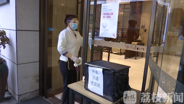 由于酒店的餐厅目前暂停堂食,仅提供早餐,早餐是无接触递送。那么,客人的午餐和晚餐怎么办呢?在门外,这家酒店专门设置了一个外卖摆放箱。