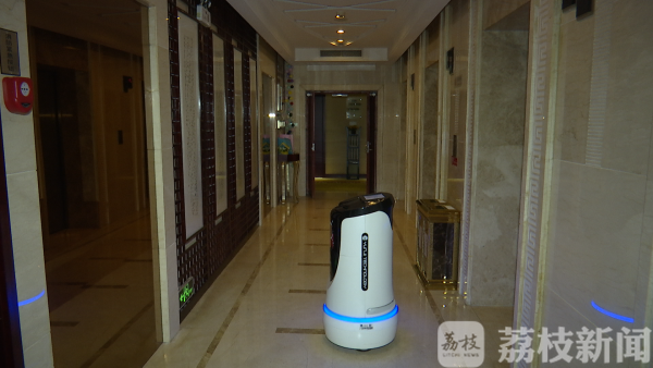 随后,检查组又来到南京湖南路的一家四星级酒店,这家酒店为客人提供也是无接触送餐,服务员是这台机器人小哥。
