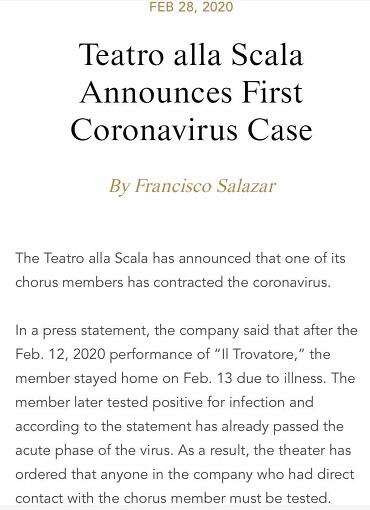 欧洲当地时间2020年2月28日,据OPERAWIRE网站的记者Francisco Salazar报道,位于意大利米兰的斯卡拉歌剧院正式宣布剧院合唱团的一名成员感染上了新冠病毒。