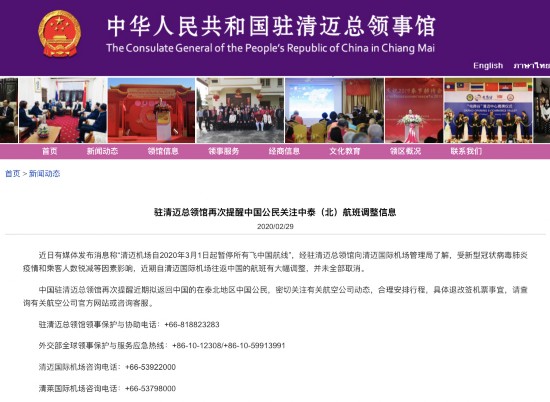 近日有媒体发布消息称“清迈机场自2020年3月1日起暂停所有飞中国航线”,经驻清迈总领馆向清迈国际机场管理局了解,受新型冠状病毒肺炎疫情和乘客人数锐减等因素影响,近期自清迈国际机场往返中国的航班有大幅调整,并未全部取消。
