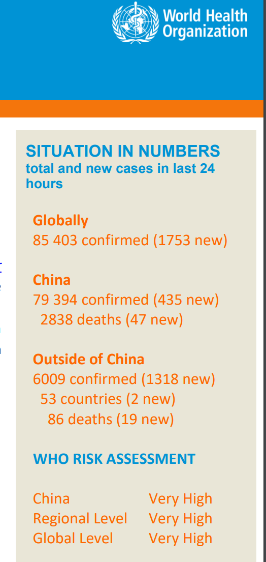 根据世界卫生组织当地时间2月29日发布的全球最新疫情数据,截止中部欧洲时间29日上午10时(北京时间29日17时),全球共确诊85403例新型冠状病毒肺炎病例。其中,中国确诊79394例,中国境外地区确诊6009例。