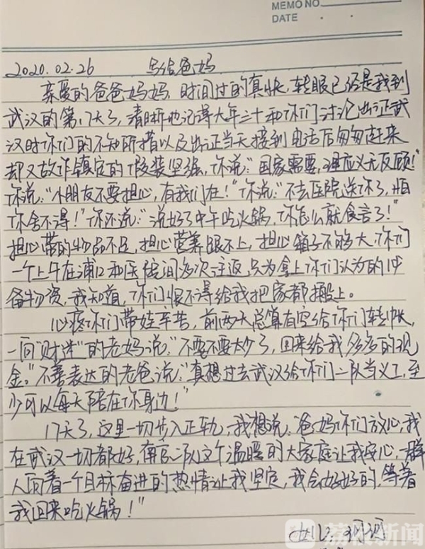 “爸妈你们放心,我在武汉一切都好 …… 我会好好的,等我回来吃火锅!”2 月 26 日深夜,第五批江苏援湖北医疗队队员吴林珂忙完工作,动笔给爸爸妈妈写了一封信。她告诉我们,自己到武汉十几天了,“有点想家了!本来想录个视频的,录到一半录不下去了。”