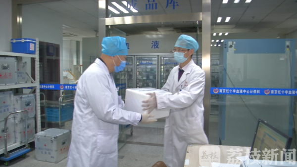 当天下午2点半,在南京红十字血液中心,芜湖血站的工作人员,接过南京血站200毫升O型康复者血浆。
