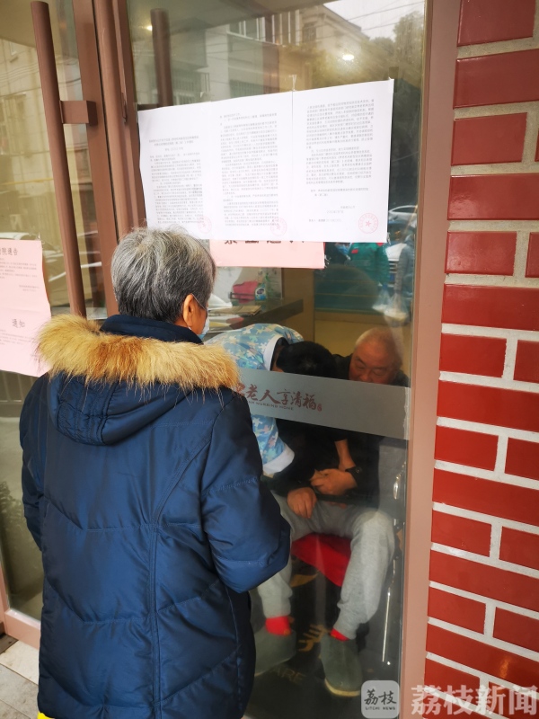 3月1日上午9点半,在南京洪武路街道养老综合服务中心门口,此时,这家养老机构的大门依旧紧锁,市民胡女士通过玻璃窗同老伴儿匆匆见了一面。胡女士说,养老院封闭管理之后,由于老伴儿不会用手机,现在自己只要一有空就会过来隔着窗子看看他。“他是脑梗后引起的老年痴呆,我来得比较勤,已经这样看一个月了。前段时间他有点受凉发烧,现在告诉我已经好了,但是我年纪大了还是有点不放心。”南京市民胡女士说。