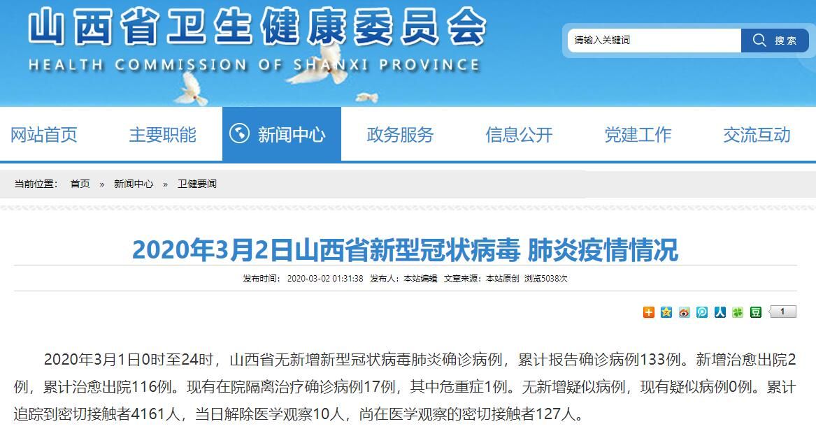 荔枝新闻讯 据山西省卫健委官网消息, 2020年3月1日0时至24时,山西省无新增新型冠状病毒肺炎确诊病例,累计报告确诊病例133例。新增治愈出院2例,累计治愈出院116例。现有在院隔离治疗确诊病例17例,其中危重症1例。无新增疑似病例,现有疑似病例0例。累计追踪到密切接触者4161人,当日解除医学观察10人,尚在医学观察的密切接触者127人。