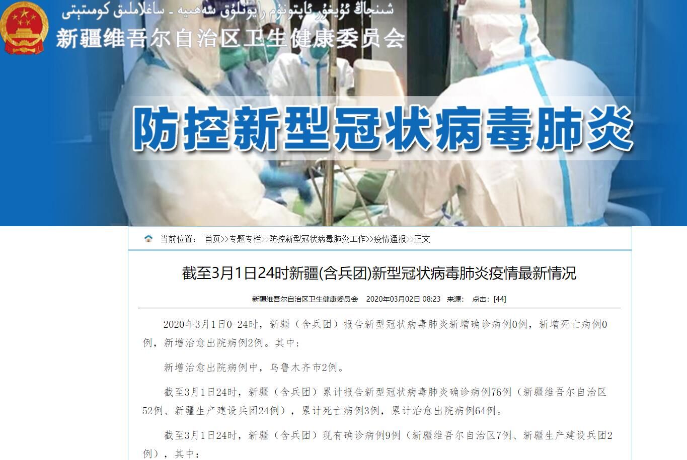 荔枝新闻讯 据新疆卫健委官网消息,3月1日,新疆维吾尔自治区(含新彊生产建设兵团)又有2例新冠肺炎确诊病例治愈出院,均为乌鲁木齐市病例。