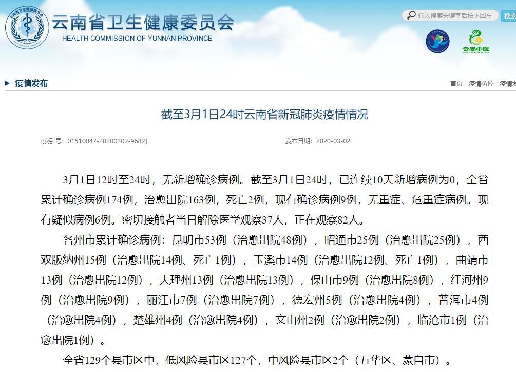 荔枝新闻讯 据云南省卫健委官网消息,3月1日12时至24时,无新增确诊病例。截至3月1日24时,已连续10天新增病例为0,全省累计确诊病例174例,治愈出院163例,死亡2例,现有确诊病例9例,无重症、危重症病例。现有疑似病例6例。密切接触者当日解除医学观察37人,正在观察82人。