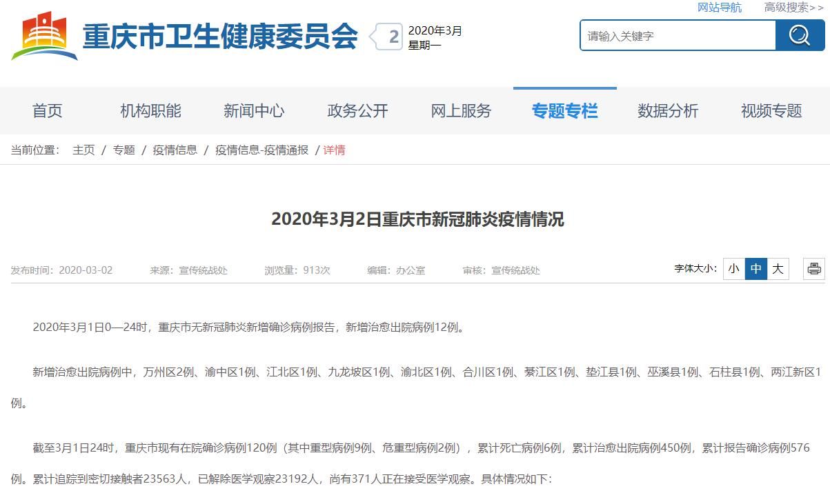 截至3月1日24时,重庆市现有在院确诊病例120例(其中重型病例9例、危重型病例2例),累计死亡病例6例,累计治愈出院病例450例,累计报告确诊病例576例。累计追踪到密切接触者23563人,已解除医学观察23192人,尚有371人正在接受医学观察。