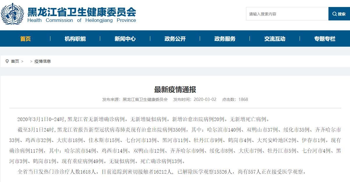 荔枝新闻讯 据黑龙江省卫健委官网消息,2020年3月1日0-24时,黑龙江省无新增确诊病例。无新增疑似病例。新增治愈出院病例20例。无新增死亡病例。