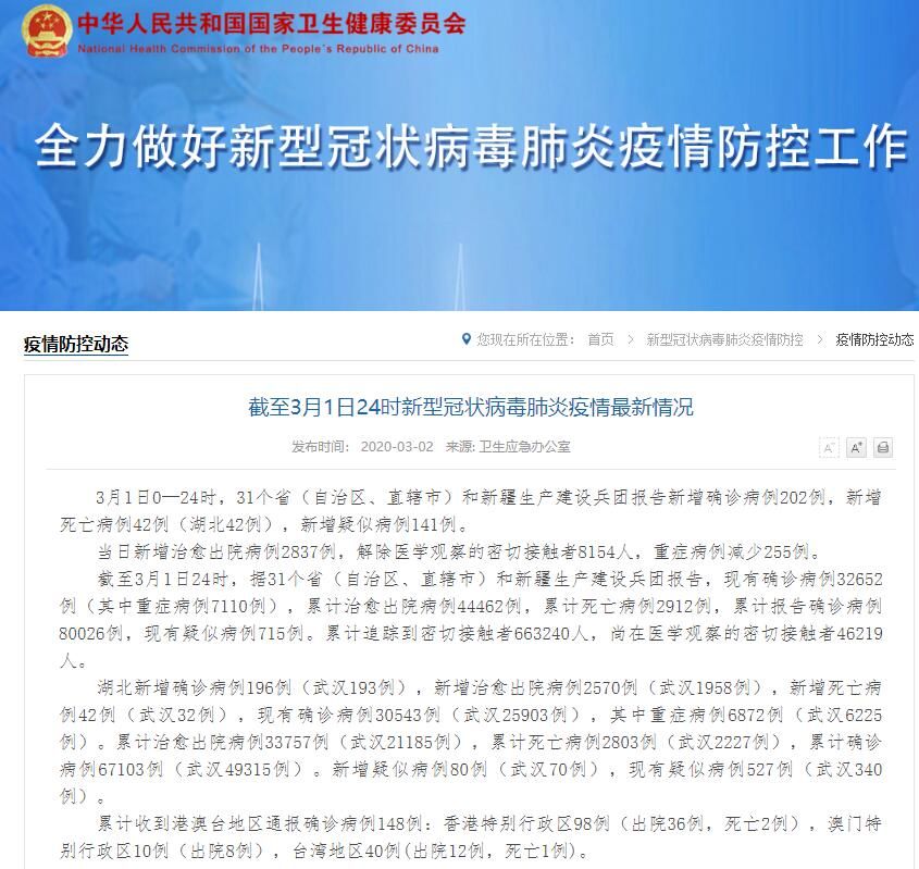 截至3月1日24时,据31个省(自治区、直辖市)和新疆生产建设兵团报告,现有确诊病例32652例(其中重症病例7110例),累计治愈出院病例44462例,累计死亡病例2912例,累计报告确诊病例80026例,现有疑似病例715例。累计追踪到密切接触者663240人,尚在医学观察的密切接触者46219人。