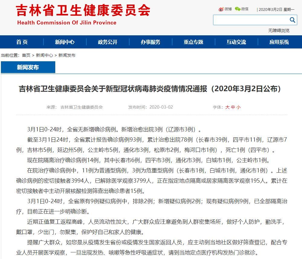 截至3月1日24时,全省累计报告确诊病例93例,累计治愈出院78例(长春市39例,四平市11例,辽源市7例,吉林市5例,延边州5例,公主岭市5例,通化市3例,松原市2例,梅河口市1例),死亡1例(四平市)。