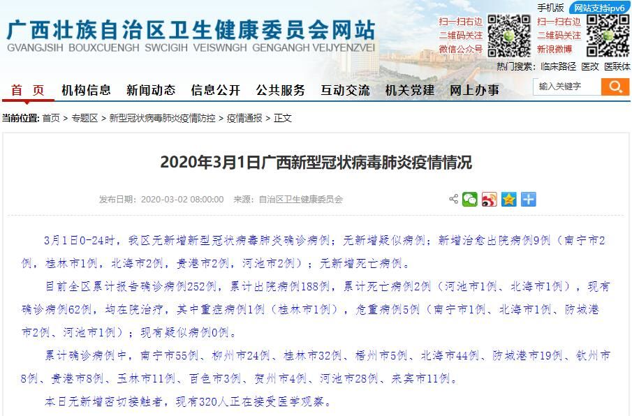 目前,广西全区累计报告确诊病例252例,累计出院病例188例,累计死亡病例2例(河池市1例、北海市1例),现有确诊病例62例,均在院治疗,其中重症病例1例(桂林市1例),危重病例5例(南宁市1例、北海市1例、防城港市2例、河池市1例);现有疑似病例0例。