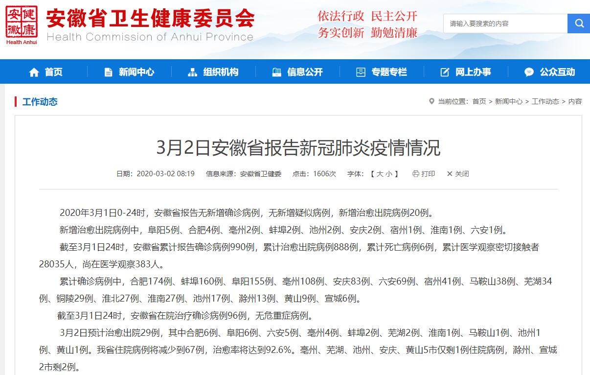 截至3月1日24时,安徽省累计报告确诊病例990例,累计治愈出院病例888例,累计死亡病例6例,累计医学观察密切接触者28035人,尚在医学观察383人。