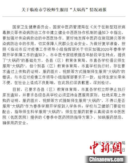 2日,临沧市教育体育局发布《关于临沧市学校师生服用“大锅药”情况通报》称:为做好复学准备,按照《临沧市应对疫情工作领导小组指挥部关于切实加强2020年春季学期开学保障工作的通知》,中医专家组根据各年龄段学生特点,提供了“大锅药”的基础处方,各县(区)教育体育局、市直各学校倡议师生服用“大锅药”,但个别县(区)教育体育局、市直学校执行时,存在要求通过上传购药证明、服药图片、视频等方式强制师生服用“大锅药”的错误,与市应对疫情工作领导小组指挥部要求不一致,给师生家长带来不便,在社会上造成不良影响,在此我们深表歉意、深刻检讨。