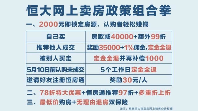 78折叠加恒房通推荐97折,2000元定金撬动3.5万+奖励……3月1日起,恒大的“全民赚钱游戏”再度强势刷屏。精明网友不难发现,恒大玩法已不仅是购房者的“买房折扣”,而是几乎辐射所有人的“躺赚”。