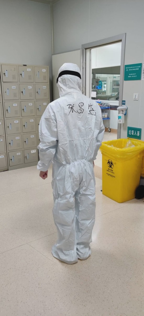 ▲重返一线,同事在他的防护服上写上“张昌盛”。受访者供图