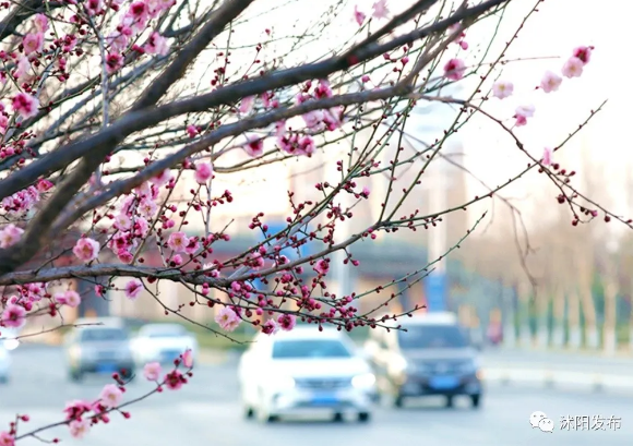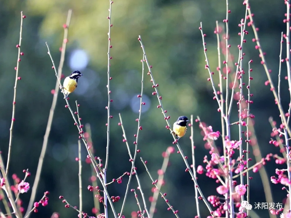 在沭河公园内,幽幽花香引来鸟儿驻足,梅花、啼鸟相映成趣,焕发出勃勃生气。