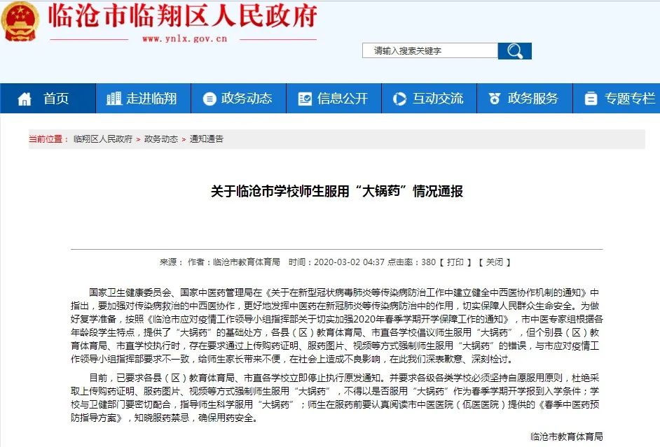 新闻是这么写的:近日,临沧市为做好复教复课准备,组织全市师生、家长服用“大锅药”,其中包括3—6岁的学生;临沧市第二中学还下发通知,要求家长将购买时的药方、服用情况拍照传给班主任,学生按照要求服药后,才能报到入学。