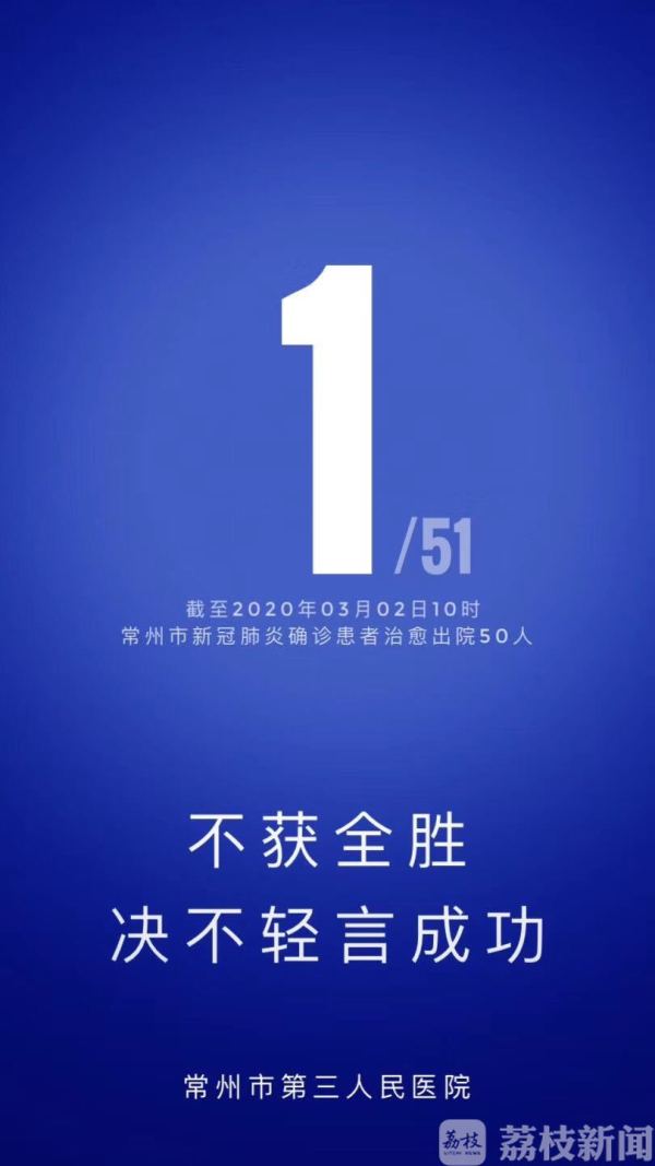 记者从常州卫健部门获悉,常州市第三人民医院今天(3月2日)上午又有2例新冠肺炎患者治愈出院。截至目前,常州市治愈出院的确诊新冠肺炎病例共计50人。