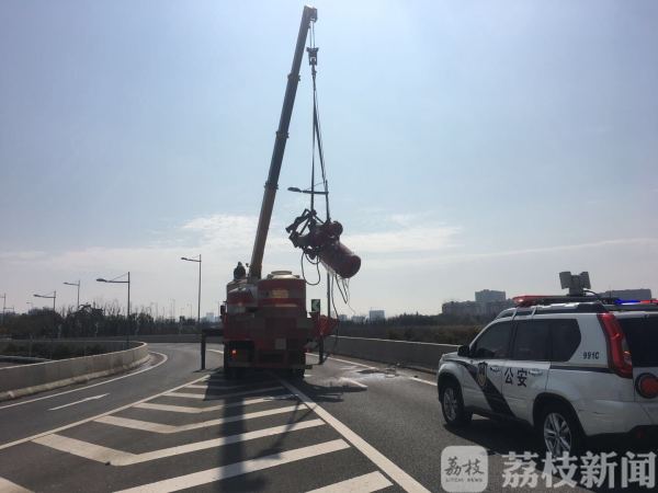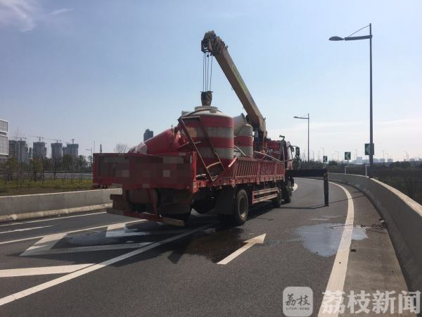 3月1日11时,南京高速五大队民警巡逻至机场高速往机场方向龙西互通时,发现匝道里有个体积较大的东西,一辆红色的大货车停在货物的前方,过往的车辆纷纷避让。