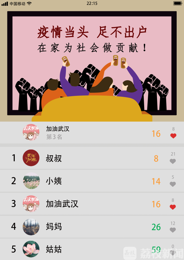 设计说明:作品是以微信运动的画面来呈现的,置顶背景是一家人在家里看电视,呼吁大家在特殊时期,要尽量呆在家里,不要外出聚集,避免病毒传播。图片下方的步数排名也是从最多为第一,改动成立了步数最少的排名第一。