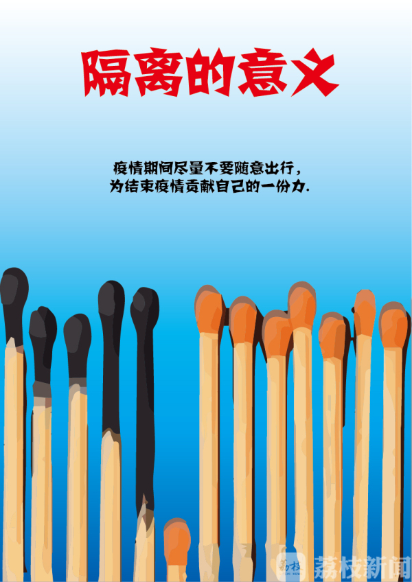 设计说明:肺炎会因为人与人之间的社交而肆意传染,所以人们都要呆在家里,这样就阻断传播的桥梁,我用排列的火柴来比喻现在的情况,只要有一个火柴后退下去,就能保证后面所有的火柴不被点燃,这样比较简明的告诉人们隔离的重要性,不能随意出门,救的不仅仅是自己。