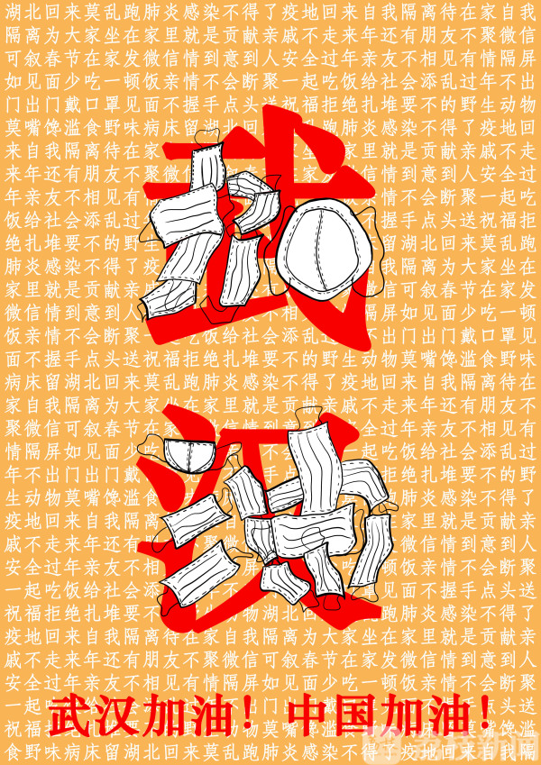 设计说明:这张海报的主题就是武汉加油,这次疫情主要爆发于武汉,所以我用了“武汉”两个字撑起了整张海报,在“武汉”两个汉字的上面,我用手绘口罩图案的形式拼出了“加油”两个字,意思就是为武汉加油,希望武汉的所有人民都能安全度过这次难关!背景是一些关于这次疫情的顺口溜,也是希望所有人们重视这次疫情!